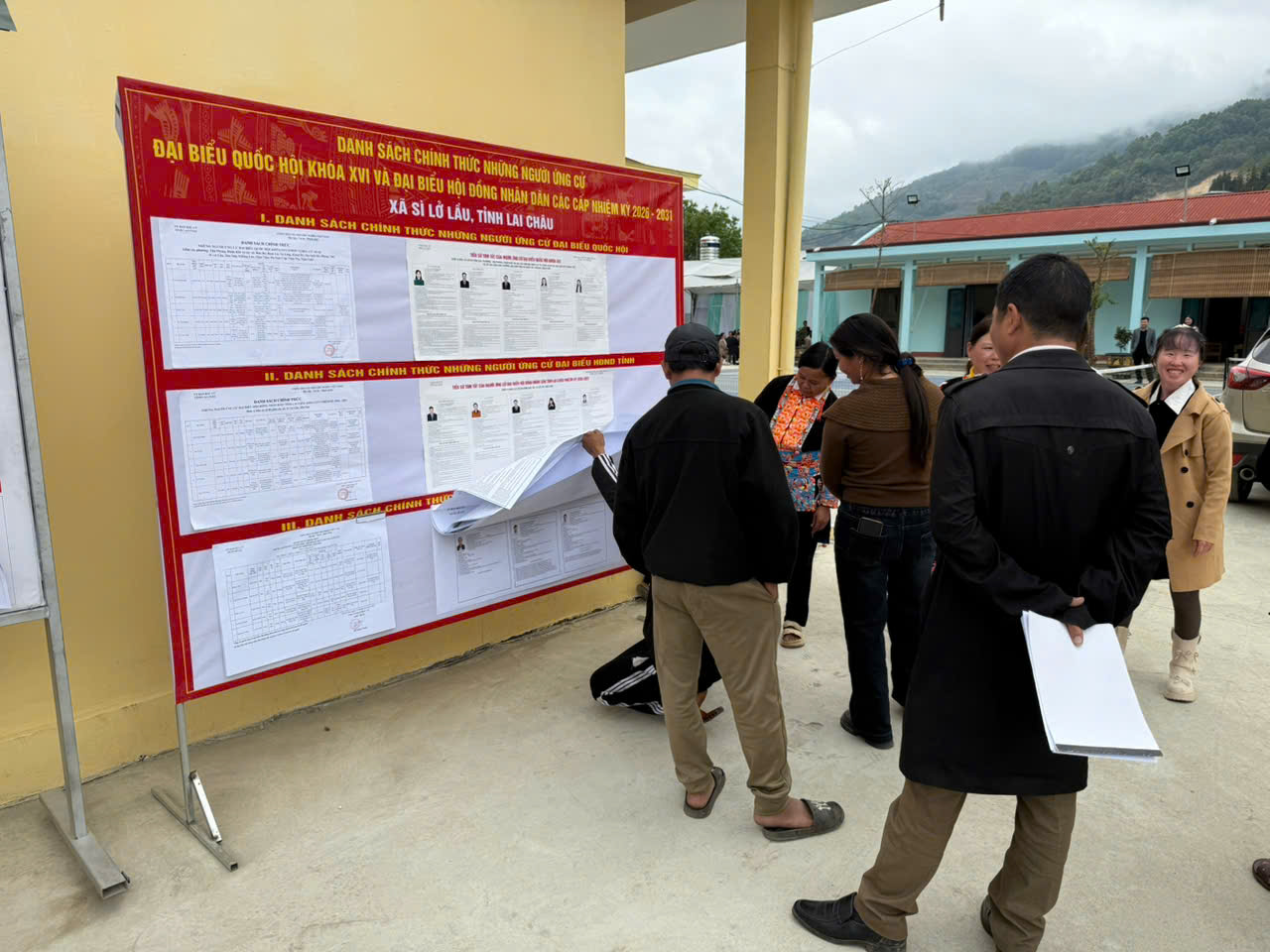 Cử tri xã Sì Lở Lầu xem thông tin niêm yết tiểu sử tóm tắt của các ứng cử viên đại biểu Quốc hội khóa XVI và đại biểu HĐND các cấp nhiệm kỳ 2026–2031