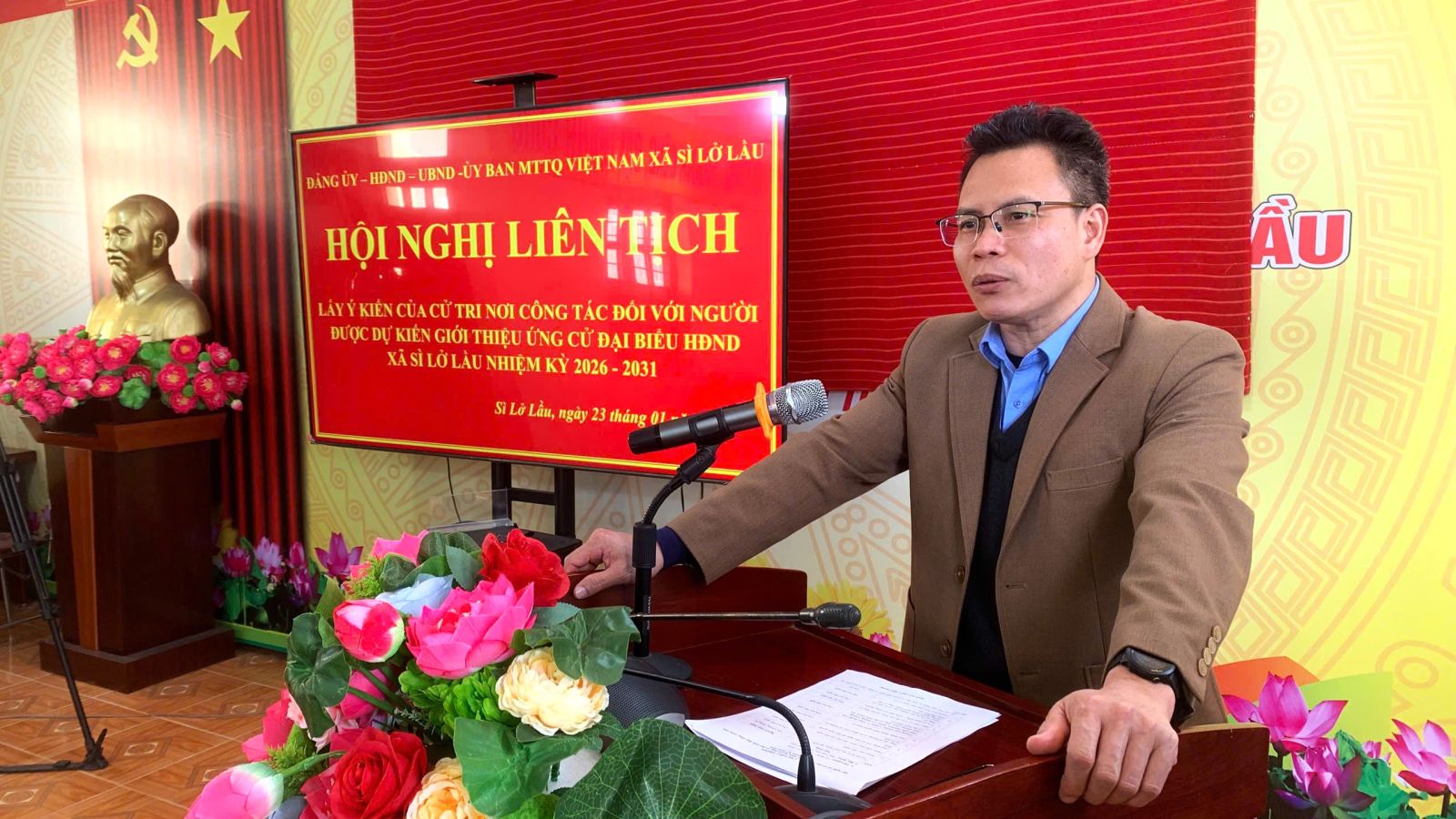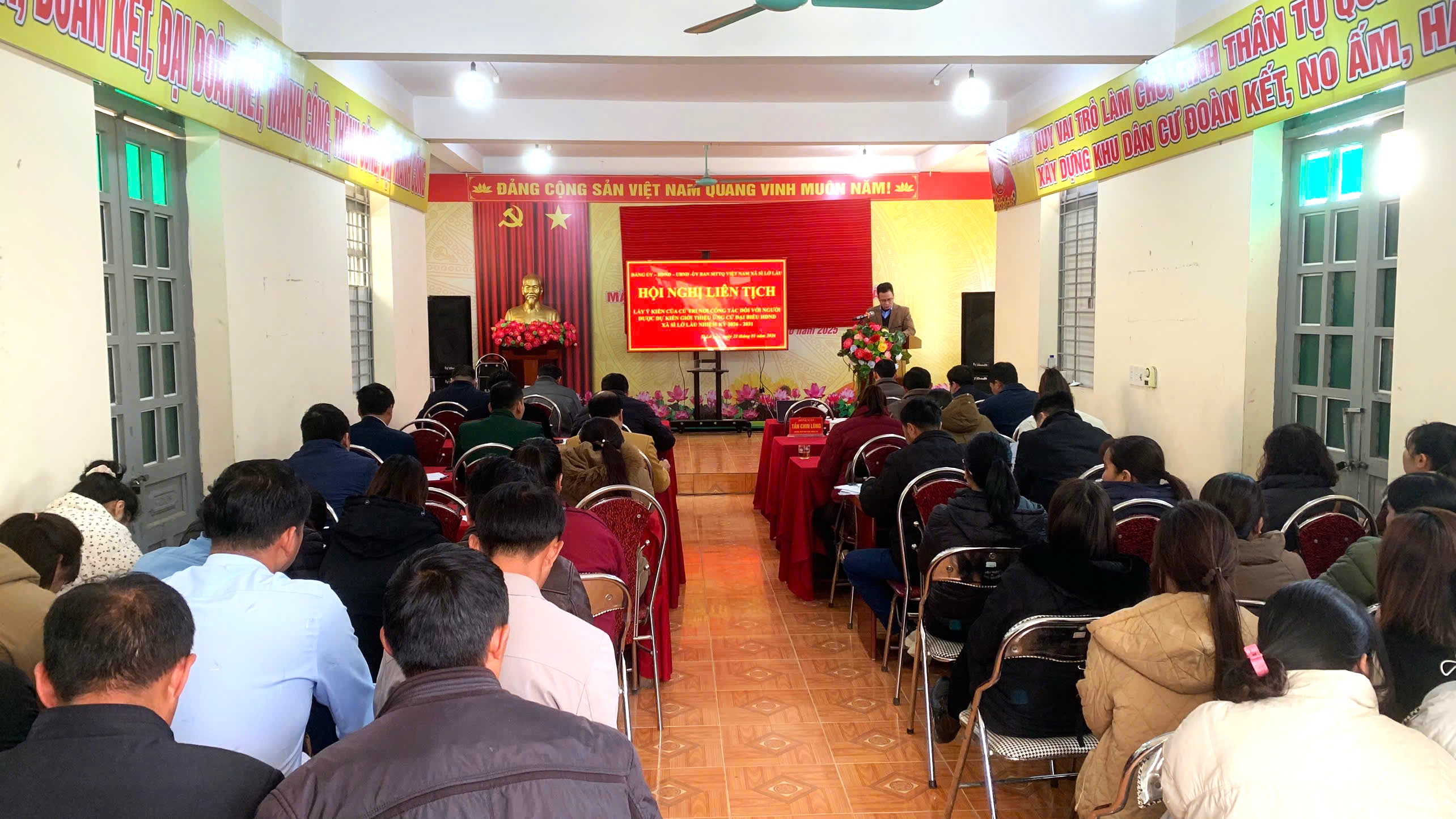 Chiều ngày 23/01, Đảng ủy - HĐND - UBND - Ủy ban MTTQ xã Sì Lở Lầu tổ chức Hội nghị lấy ý kiến cử tri nơi công tác đối với những người ứng cử Đại biểu HĐND xã Sì Lở Lầu khoá III, nhiệm kỳ 2026 - 2031. Đồng chí Trần Bảo Trung – Bí thư Đảng ủy, Chủ tịch HĐND xã chủ trì Hội nghị. Tham dự hội nghị có đồng chí Đỗ Xuân Thủy – Phó Bí thư, Chủ tịch UBND xã; đại diện cấp ủy Đảng, Thường trực HĐND, lãnh đạo UBND, Ủy ban MTTQ cùng toàn thể cử tri là cán bộ, công chức đang công tác tại cơ quan, đoàn thể xã.