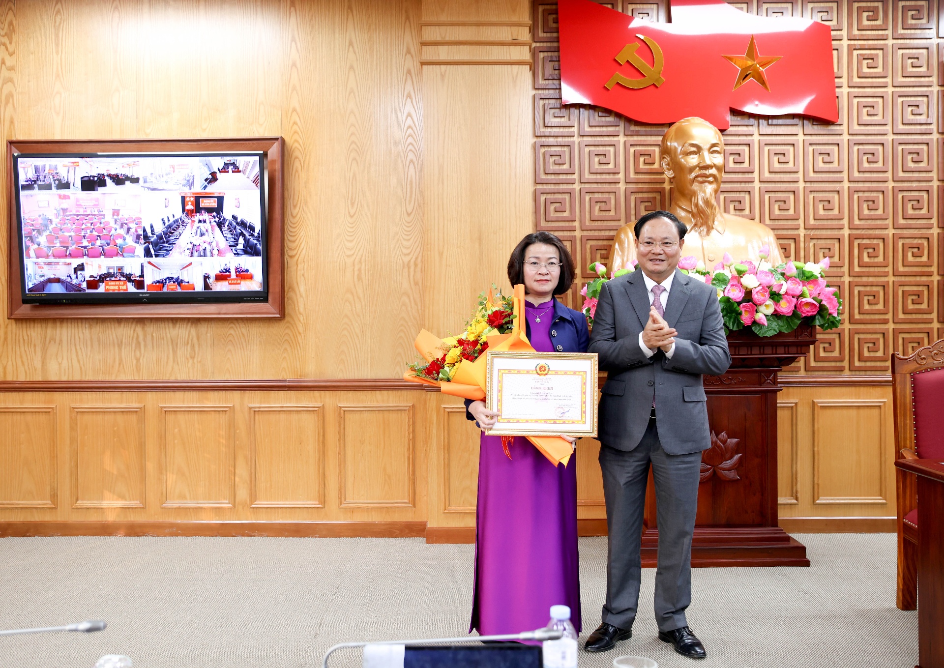 Thừa uỷ quyền của Ban Tổ chức Trung ương, Bí thư Tỉnh uỷ Lê Minh Ngân trao Bằng khen cho đồng chí Lê Thị Hường - Uỷ viên Ban Thường vụ, Trưởng Ban Tổ chức Tỉnh uỷ có thành tích xuất sắc trong công tác xây dựng Đảng năm 2025.
