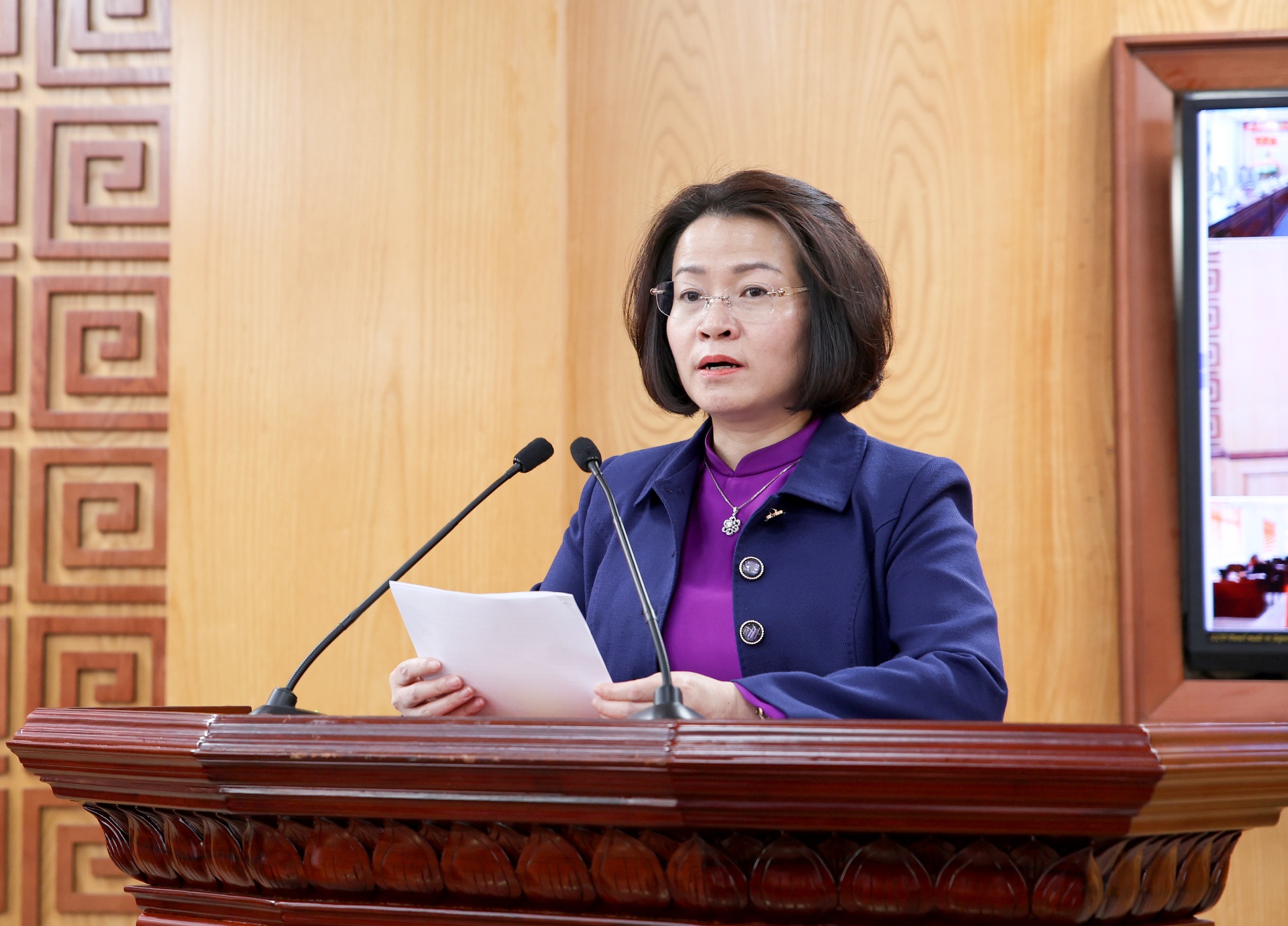 Đồng chí Lê Thị Hường - Uỷ viên Ban Thường vụ, Trưởng Ban Tổ chức Tỉnh uỷ phát biểu tiếp thu ý kiến chỉ đạo của Bí thư Tỉnh uỷ Lê Minh Ngân tại hội nghị.
