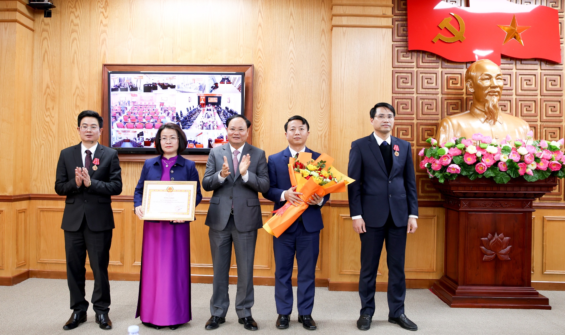 Thừa uỷ quyền của Chủ tịch nước Cộng hoà xã hội chủ nghĩa Việt Nam, Bí thư Tỉnh uỷ Lê Minh Ngân trao Huân Chương lao động Hạng nhì cho đồng chí Mạc Quang Mạnh - Phó Trưởng Ban Tổ chức Tỉnh uỷ; Huân Chương lao động Hạng ba cho đồng chí Vũ Thanh Xuân - Phó Trưởng Ban Tổ chức Tỉnh uỷ.
