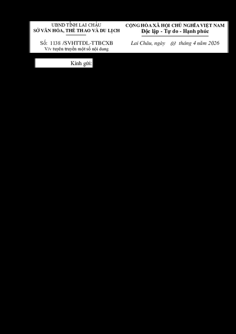 | Số hiệu | Số:1138 /SVHTTDL-TTBCXB | Cơ quan ban hành | UBND TỈNH LAI CHÂU SỞVĂN HÓA, THỂ THAO VÀ DU LỊCH |